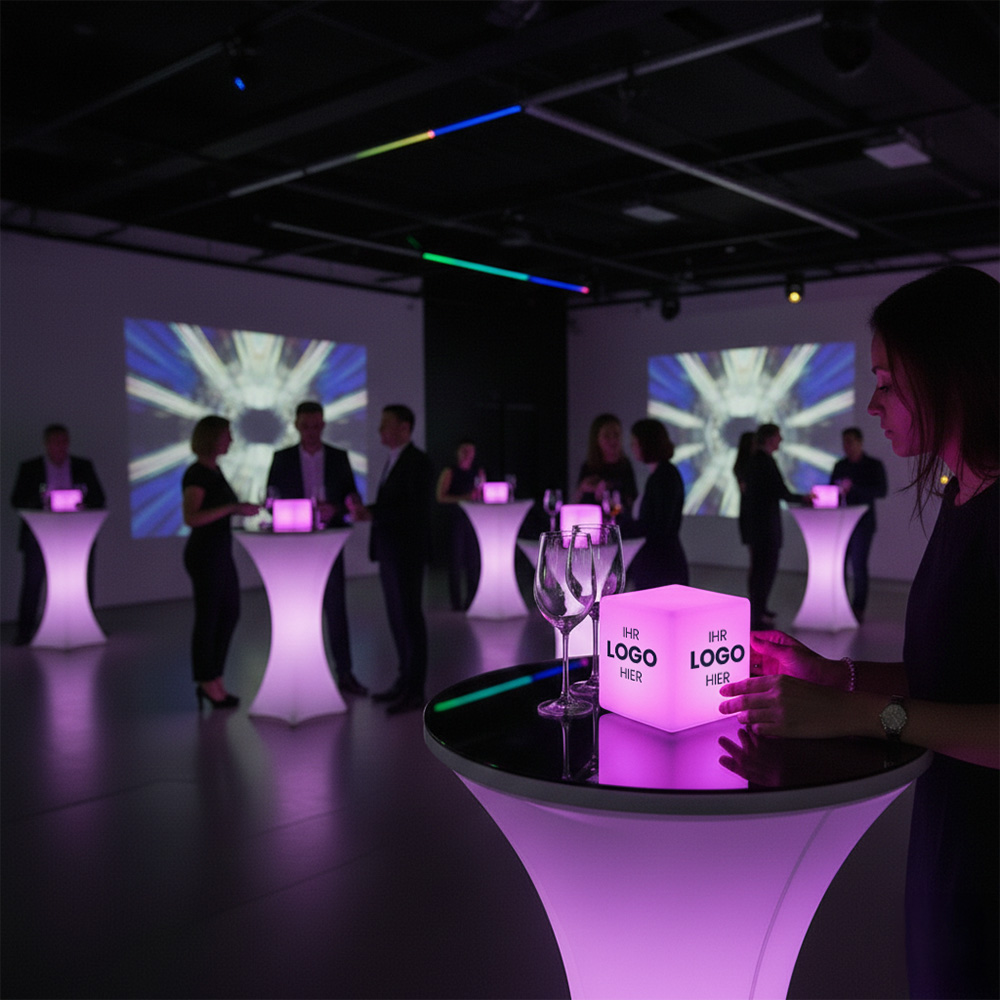 Mit unserem handlichen LED Tischwürfel setzen Sie auf eine stimmungsvolle Atmosphäre auf Ihrem nächsten Werbe-Event. Aufmerksamkeitsstark auf Tischen platziert, sorgen Sie für einen farbigen LED Hingucker! Auf Wunsch auch mit Branding.